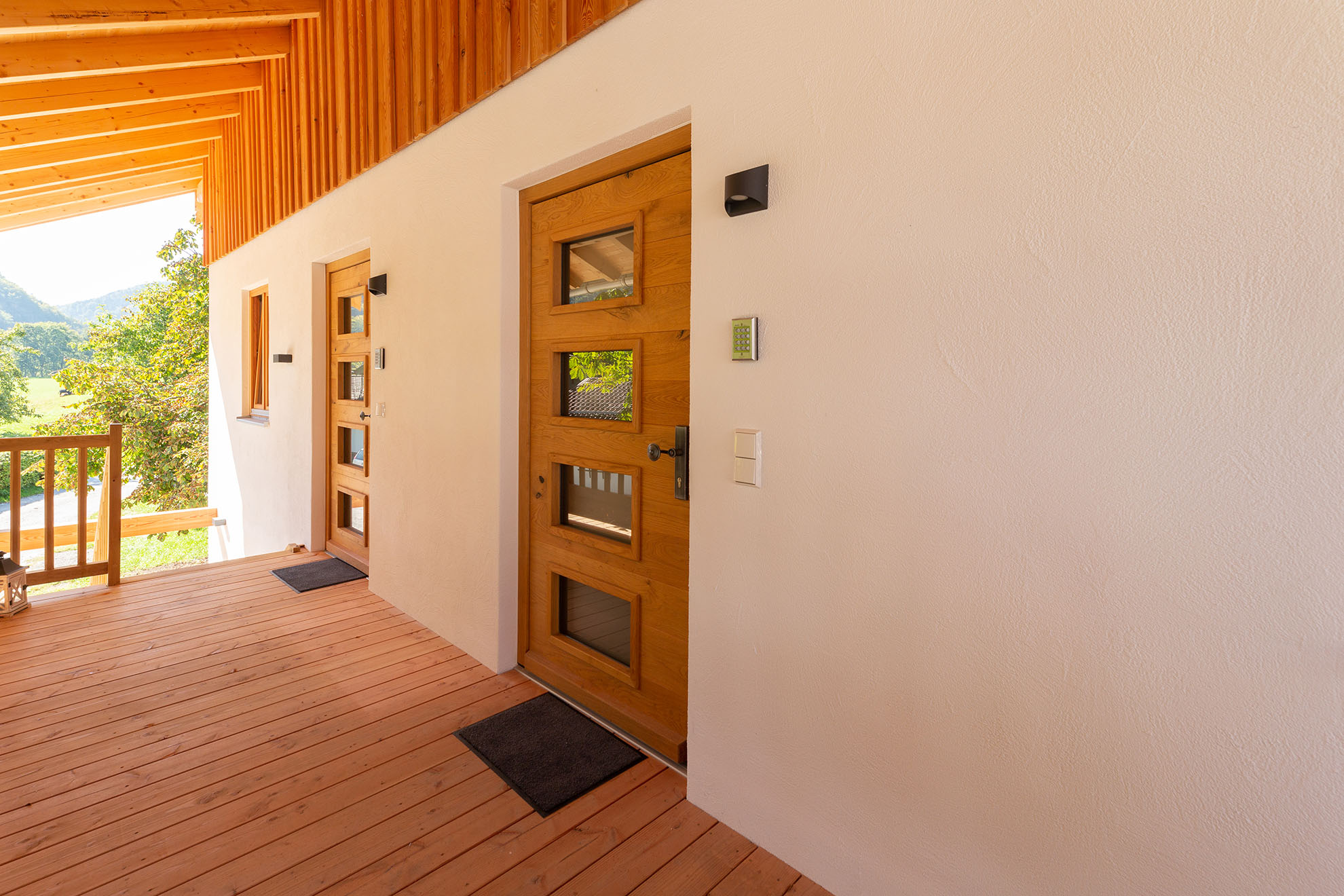 Diese Ferienwohnung befindet sich im Obergeschoß links. Vom Balkon aus haben Sie einen Blick auf die Berge.